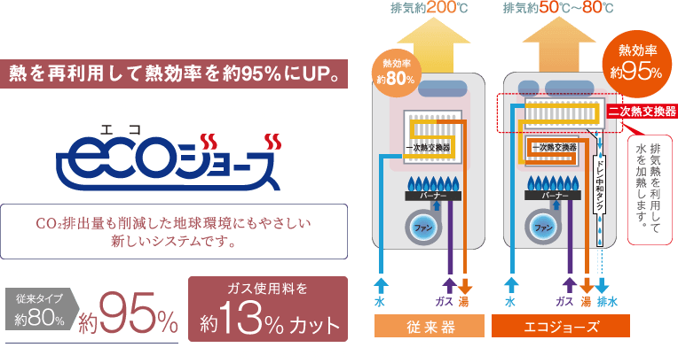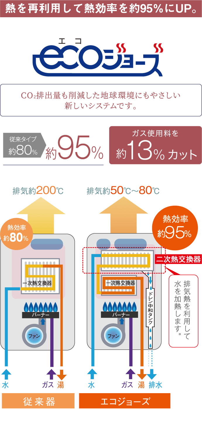 大洗浄5L、小洗浄3.8Lの「超節水ECO5トイレ」。従来品(大13L)と比べ約69%の節水を実現。2日でおフロ1杯分以上(280L)節約できます。また、水道料金なら年間約13,800円もお得です。